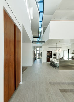 One of major design requests the client required was a home with lots of natural light. Achievable on the exterior façade, we also wanted to light the center portion of the house. A linear split (continuous linear skylight) was introduced down the buildings length to allow for natural light to seep into the center of the house. This prompted o!setting the second floor circulation from the first floor creating a continuous two-story volume of open space, naturally lit from above. This split became a central organizational spine, a main feature to the project. It naturally tracks the suns east/west path throughout the day, providing an ever changing sequence of daylighting experiences, as well as defining the main circulation route within.